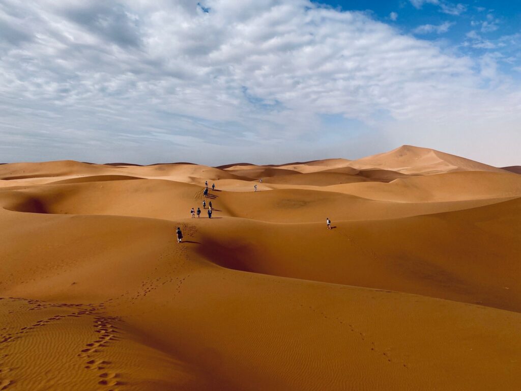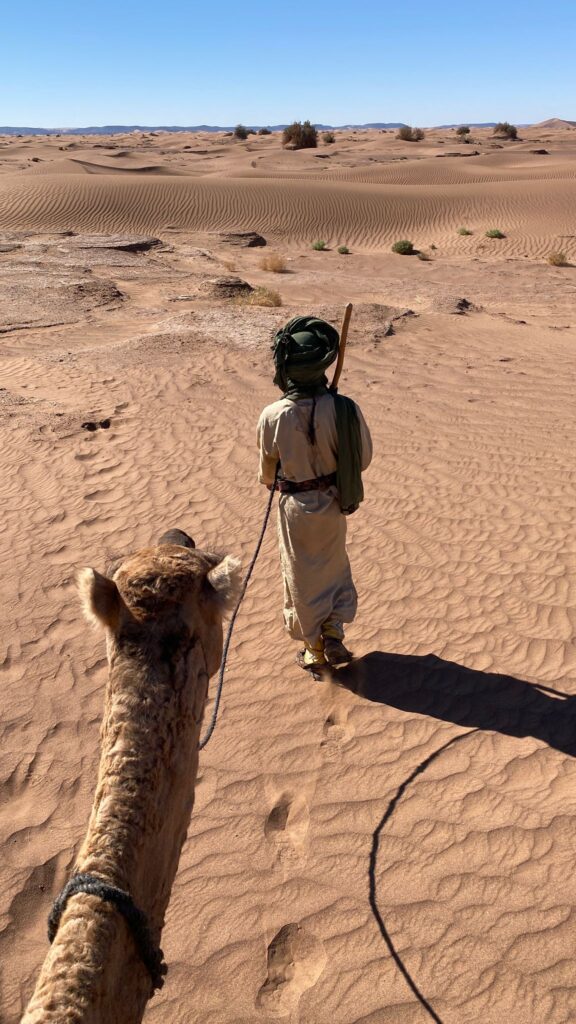 We walk 2h30 to 3h30 hours per day. The trek is rather easy (no change in altitude and we don’t need to climb the dunes, we walk between them on a hard surface) and we adapt the pace according to the group. We are accompanied by the camel caravan and the Nomads team. Luggage is carried by the camels. Each participant has his/her own small backpack during the trek for water, camera, any personal items. For people who have difficulty walking this long, a camel can be rented at an extra cost.