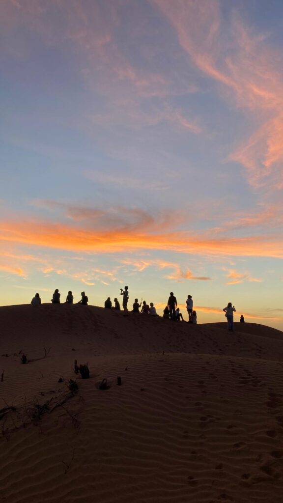 For sleeping arrangements: we bring along large collective tents, as well as mattresses and blankets. We suggest participants to bring their own sleeping bag. Participants can sleep in the tents or under the stars around the fire or on the dunes. Everyone is free to choose.